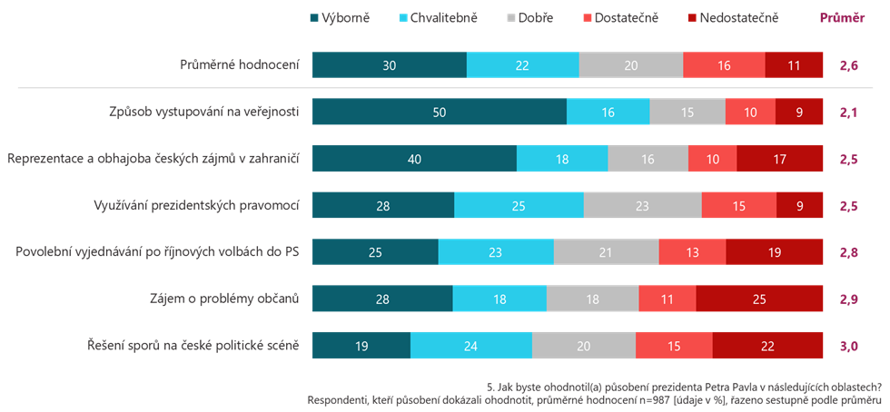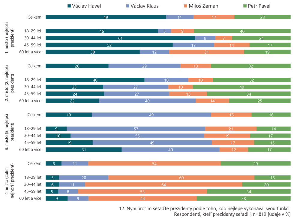 Pořadí v hodnocení prezidentů: 1) Václav Havel, 2) Petr Pavel, 3) Václav Klaus, 4) Miloš Zeman. Václav Havel je dlouhodobě nedostižitelný. Petr Pavel je pozitivně hodnocen za způsob vystupování na veřejnosti či reprezentaci a obhajobu českých zájmů v zahraničí. Prostor pro zlepšení je stále u řešení sporů na tuzemské politické scéně.