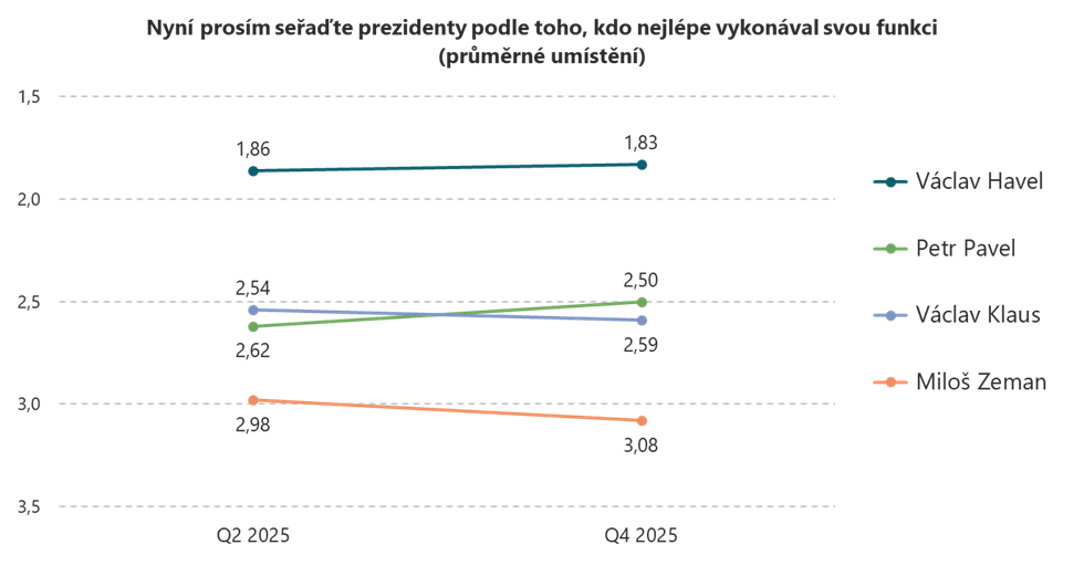Lidé za nejlepšího porevolučního prezidenta ČR vnímají stále Václava Havla. Jako druhý je nově hodnocen současný prezident Petr Pavel, třetí nejlepší je v průměru uváděn Václav Klaus (který je nejméně polarizující), čtvrtou příčku pak zaujal Miloš Zeman.